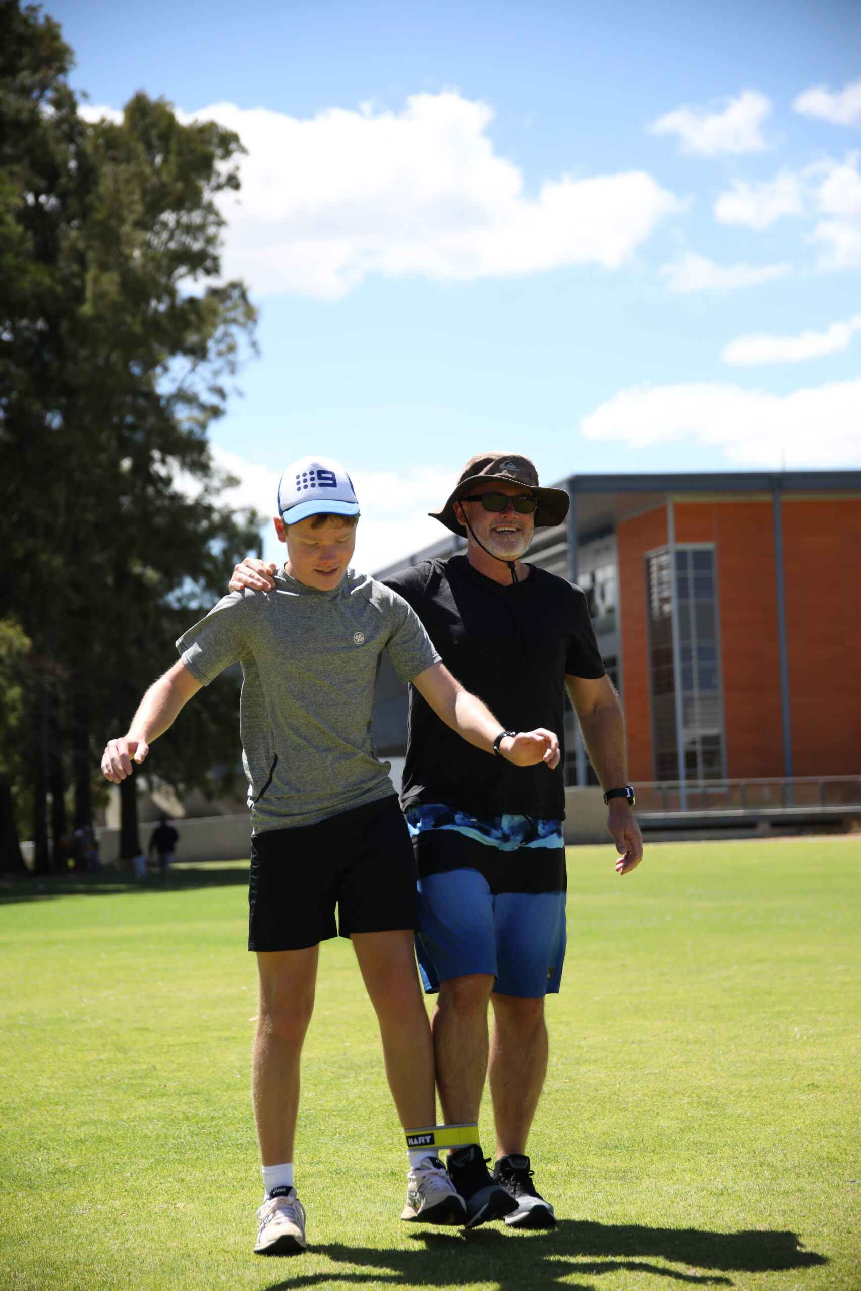 Father and teenage child, all smiles, doing a 3 legged race together