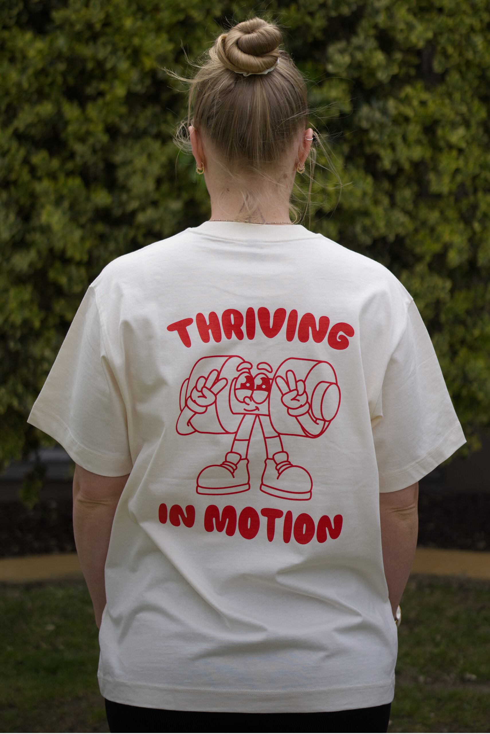 Unisex box fit, heavy weight cotton, t-shirt in ecru (light cream) colour. Red dumbbell graphic on back and red Thriving in Motion text on front .