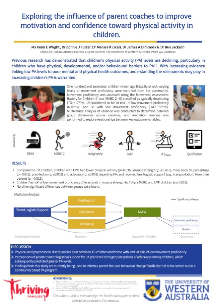 Four out of five children do not meet current recommendations for physical activity, in particular, those children with physical, developmental &/or behavioural barriers. One reason for this problem is a lack of physical literacy (i.e. the motivation, confidence, physical competence, knowledge, and understanding that help individuals maintain regular physical activity throughout life). This research will evaluate the feasibility and effectiveness of utilising parent ‘coaches’ and a community based physical activity program to improve the physical literacy outcomes of children.
