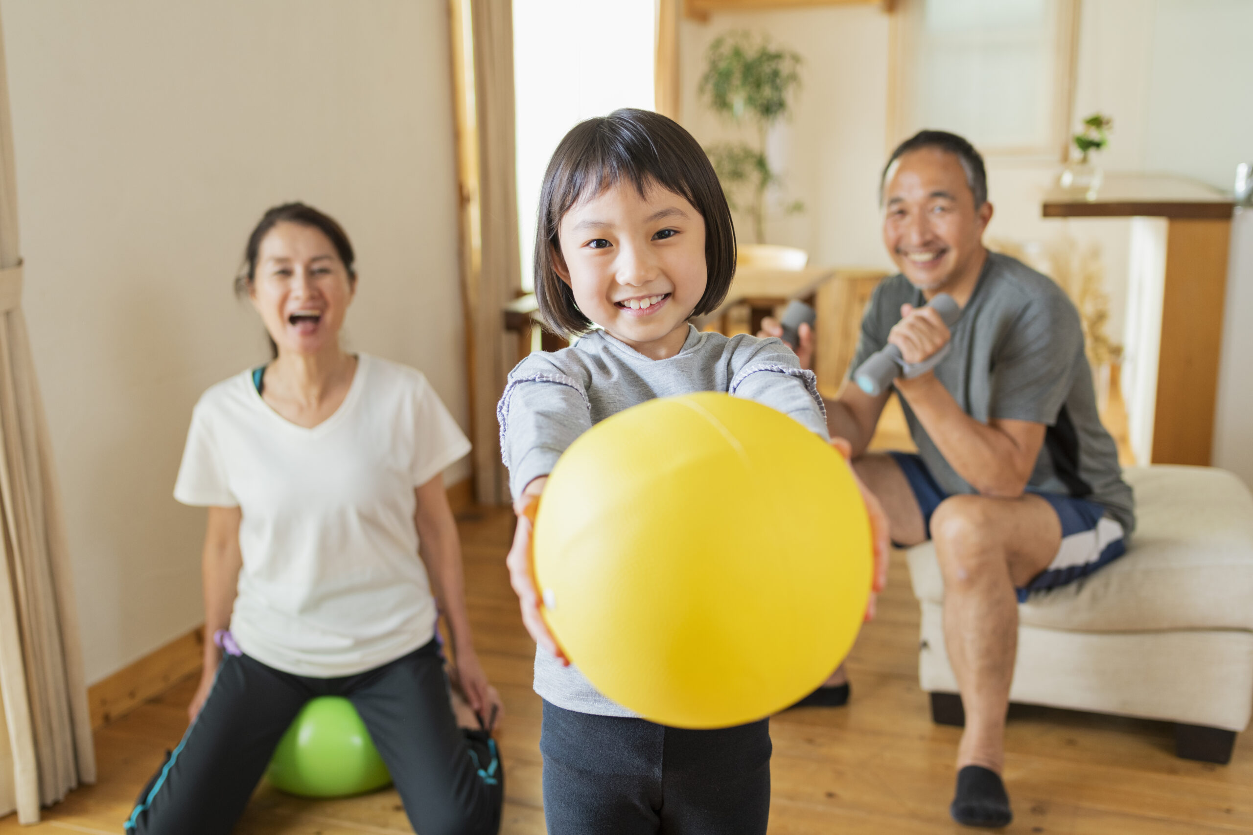 Grandparents and grandchildren exercising at home